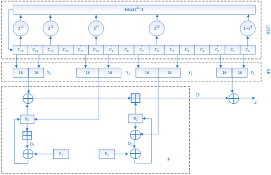 As shown in Figure 2, the Pseudo-random number generator (PRNG) is composed of a linear feedback shift register (LFSR), a bit recombination (BR), and nonlinear function F. Among them, R1 and R2 are two 32-bit memory cells, and F1 and F2 are two chaotic functions, respectively. PRNG execution produces a 32-bit Z at a time, which forms the output of the key stream by combining 32-bit Z. Literature [25] suggests that PRNG discards the first 100 values and uses post-order values, given the security of the password.
