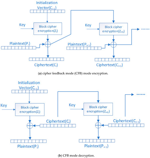 As a block encryption algorithm, AES supports multiple encryption modes to meet different security requirements and transmission requirements. For example, Electronic codebook (ECB), Cipher-block chaining (CBC), Cipher feedback (CFB), Output feedback (OFB), and so on. In fact, the ECB mode is a common encryption mode of the AES. In CFB mode, CFB converts block ciphers to stream ciphers. Figure 3 shows the working mode of CFB.