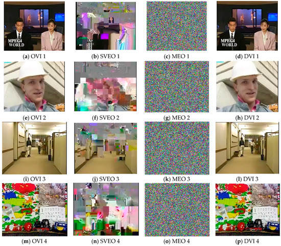 In our proposed scheme, we encrypt the IPM, RC, Delta QP, and MVDs semantic elements in the video sequence by means of fragmentation, which guarantees the visual perception security of video encryption. This paper proposes a new five-dimensional (5-D) hyperchaotic algorithm to protect data privacy in order to further improve the security of video encryption. Only four benchmark sequence renderings are shown here due to space limitations (Figure 6). This includes the original video image (OVI) (OVI 1, OVI 2, OVI 3, OVI 4), Selective video encryption output (SVEO) (SVEO 1, SVEO 2, SVEO 3, SVEO 4), Mixed encrypted output (MEO) (MEO 1, MEO 2, MEO 3, MEO 4), and the decrypted video image (DVI ) (DVI 1, DVI 2, DVI 3, DVI 4). Where, the first column in Figure 6 is the original video image. The second column in Figure 6 is selective video encryption output. The third column in Figure 6 is the mixed encrypted output. The last column in Figure 6 is the decrypted video image. The mixed encryption output is the mixed encryption result. The specific step is to perform selective encryption first and then perform 5-D hyperchaotic encryption.