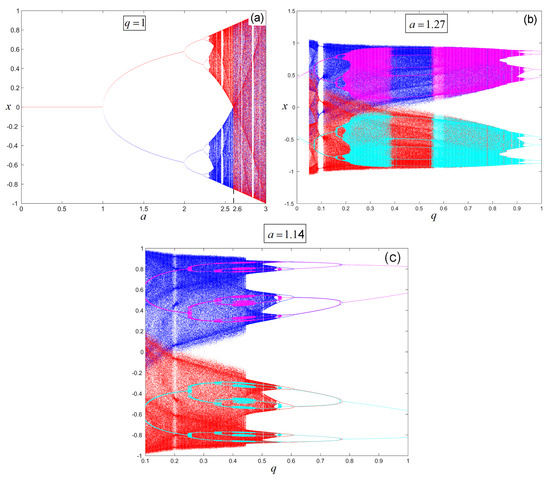 Bifurcation diagrams of the Puu system of IO and FO. (a) bifurcation of the Puu system of IO vs. parameter a; (b) bifurcation of the Puu system of FO vs. q for ; (c) bifurcation of the Puu system of FO for .