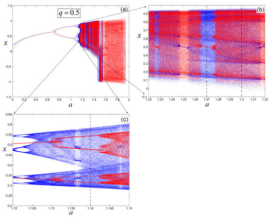 It is usual to have multiple attractors for a dynamical system. Each of them can be considered as the attractor for a given initial condition within its own attraction basin. In the bifurcation diagram vs. , presented in Figure 1a, the Puu system of IO (1) reveals two symmetric regions representing regular and chaotic attractors generated by two symmetric (negative and positive) initial conditions within two attraction basins (Due to its symmetry, the coexistence of symmetric attractors is a feature of the Puu system. Like for the cubic logistic map , the oddness of the map (1) induces an equivariance that is a -symmetry [13,14].). Therefore, attractors corresponding to in the upper (bottom) region present non-symmetric new generated points. The successive bifurcations of these points lead to chaos via the standard period-doubling cascade. In addition, note the sudden crisis—at , the previous two non-symmetric chaotic attractors (red and blue, respectively) collide and give birth to a symmetric chaotic attractor that covers both positive and negative values of x. Details on similar dynamics but related to the cubic logistic map can be found in [15].