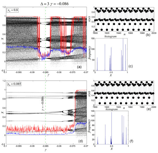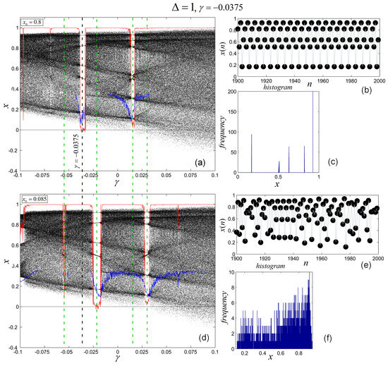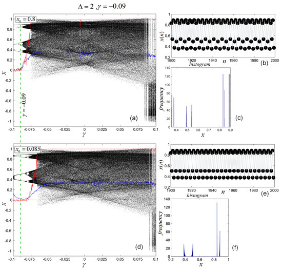 Consider within a stable CP window of period-5 for (red plot) coexisting with its chaotic counterpart (blue plot) in Figure 2b. The coexistence of the underlying stable CPO and the chaotic attractor is studied in Figure 3. Figure 3a,b present superimposed, the time series entirely and the last 100 iterations, respectively; in Figure 3c,d, superimposed, the Lyapunov exponent and the asymptotic growth rate, K, are represented, while in Figure 3e,f plot the histograms of the coexisting attractors. The chaotic attractor generated from (blue plot in Figure 3a,b is characterized by the evolution of the time series, the K value, which is close to 1, and the positiveness of the superimposed Lyapunov exponent (Figure 3d) and the histogram in Figure 3f. The stable CPO revealed after about 900 neglected iterations from the considered 2500 iterations, generated from (red plot in Figure 3a,b), is characterized by the evolution of the time series, the K value, and the superimposed , in which both are close to 0 (Figure 3c), and the discrete five peaks bars in the histogram (Figure 3e) indicating the branches of the cycle, numbered 1–5 in the zoomed time series in Figure 3b. Note that the zero value of seems to indicate a kind of Neimark–Sacker bifurcation, generating the stable CPO of period-5 which coexists with the chaotic attractor. In addition, as can be seen in Figure 3c,d, this kind of bifurcation seems to be not singular, but this subject does not represent the purpose of this paper.