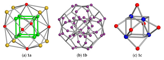 The recently proposed [10,11] cube–rhombellane 1a is a double-shell structure, designed by graph–theoretical transformation called “rhombellation” of the cube [10], which serves as a framework for chemical structures with both high complexity and symmetry, hereafter called rhombellanes. The core of the framework is the cube, shown as green spheres in Figure 1. The surface layer of 1a is composed of six hexavalent and eight trivalent vertices, shown as red and yellow spheres, respectively. The molecular realization of 1a requires the appropriate structural fragments that can establish up to six connections with neighboring atoms. According to the purpose, six-fold rings, i.e., cyclohexane or benzene, were found to be suitable.