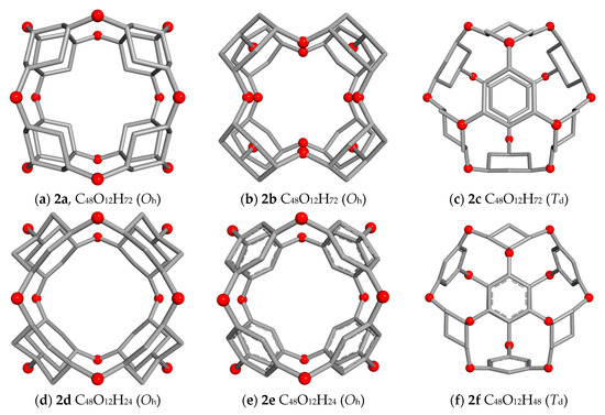 The molecules 2a–2f displayed in Figure 2 correspond to the core building blocks of the double-shell structures. Each structure included eight six-fold rings arranged at the vertices of a cube, which were linked by oxygen atoms, shown as red spheres in Figure 2. Structures 2a–2d were built only from cyclohexane rings, where the linking oxygen atom was connected to either equatorial or axial positions. Structure 2e consisted of eight benzene rings in an octahedral arrangement, whereas 2f contained both aromatic and cycloaliphatic rings, which were aligned at the vertices of a tetrahedron. Notice that each cyclohexane ring adopted a chair conformation. With one exception, structure 2b, the oxygen atoms pointed outwards from the carbon cluster.