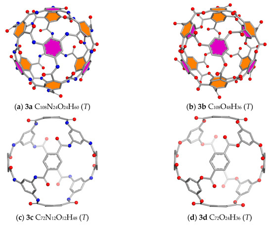 Only aromatic rings were included in the carbon framework and were connected by means of amide (3a and 3c) or ester (3b and 3d) bonds. There were two symmetry distinct rings, which were connected in an alternating pattern. One type of benzene ring had three neighbors and were aligned along the threefold rotation axis (marked in violet in Figure 3), whereas those with four adjacent aromatic rings were positioned along the twofold symmetry axis (highlighted in orange in Figure 3). Structures 3a and 3b were composed of 14 aromatic rings; the removal of four three-connected rings resulted in their corresponding molecules 3c and 3d, respectively.