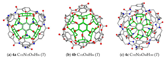 The covalent clusters shown in Figure 4 were designed by the connection of the corresponding core and shell fragments by means of –CH2O– linkers. Twelve junctions linked the two building blocks by means of covalent bonds. The studied assemblies are shown in Figure 4, where the carbon framework of the inner layers is highlighted in green. Clusters 4a and 4b were achieved by joining together a core fragment 2f with shell structures 3c and 3d, respectively. Since molecule 2f included both aromatic and aliphatic rings, the linkers were attached only to the cyclohexane rings. Energetically favorable assembly between the core layer 2c and shell fragment 3a resulted in structure 4c.
