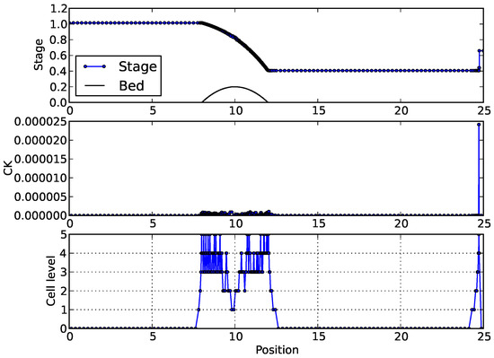 Figure 7 shows the corresponding momentum and mesh. Like in the case of the planar dam simulation, we observe that refinements occur around the rarefaction and the shock leading to an accurate solution.