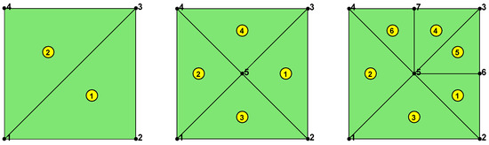 Remark 5. For the first order method, if a cell is bisected, then each of the two new cells has the same quantity values as those of the original cell. That is, suppose that the triangle T is bisected into two trianglesand. The quantityof the triangleand the quantityof the triangleare the same as the quantityof the original triangle T. In mathematical formulas For the second order method, if a cell is bisected, then quantities of each of the two new cells should be computed using proportional values of the linear reconstruction of the quantities of the original cell after implementing a slope limiter.