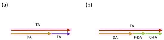 Representation of linear measurements commonly used for asymmetry analysis. (a) There is no variation between the individuals in the DA direction, therefore FA and DA vectors are not correlated. In this scenario, FA can be adequately calculated by only removing the effect of DA; (b) in case the FA vector is correlated with the DA, its component in the direction of DA (F-DA) and the orthogonal component (C-FA) cannot be effectively separated.