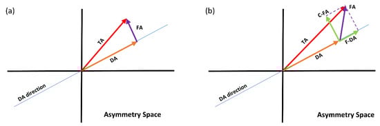 A 2D representation of the asymmetry space. The plot on the left (a) represents a case where the calculated FA vectors are orthogonal to the DA vector. The plot on the right (b) shows a scenario where the calculated FA vector has a component parallel to the DA vector.