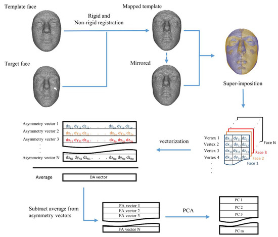 Flow chart of the algorithm used to obtain FA vectors. The template face is mapped onto each face, and the reflection is obtained. Each face and its mirror are superimposed and subtracted, and the subtraction matrix is vectorized to obtain the matrix of asymmetry vectors (TA). The average of these vectors is considered as DA, and by removing the DA from each row of the matrix, the FA vectors are calculated. Different dimensions of FA can then be explored by applying a PCA on the vectors.