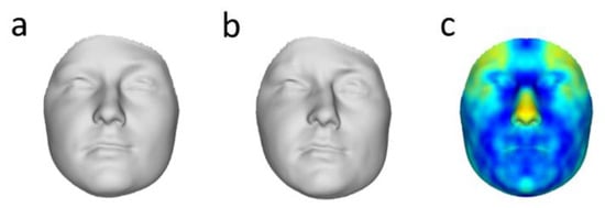 (a) Female and (b) male directional asymmetry, amplified 10 times and visualized onto the average face; and (c) heat-map of the difference between DA in both sexes. The values are scaled (amplified) equally in all three figures for visual purposes.