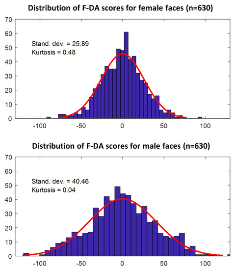 Histogram of the magnitudes of F-DA vectors for females (above) and males (below). The kurtosis measurement validates the normality of the distributions. This also suggests a lack of AS in the faces. Based on the standard deviations, we can see that the male subgroup shows a higher effect of DA on individual faces.
