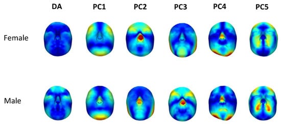 Heat map of DA and the first 5 PCs of C-FA for both males and females. The differences and similarities between the two groups are clear in this figure. The variations are scaled (amplified) for visual purposes. The blue color on the heat maps shows low variations, and the red regions correspond to high variations. The same scale has been used for both groups.