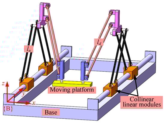 As shown in Figure 1, it has two identical branched chains, yielding symmetrical structures. Each branched chains has two identical sub-branches, so the whole mechanism can be treated as a “binary-tree” structure. This parallel manipulator is driven by four linear actuators installed on the base, and two linear actuators on one side share one stator. The entire manipulator mechanism looks like the shape of the letter “M”, and it can move along the X, Y, and Z axes and rotate about the Z axis.