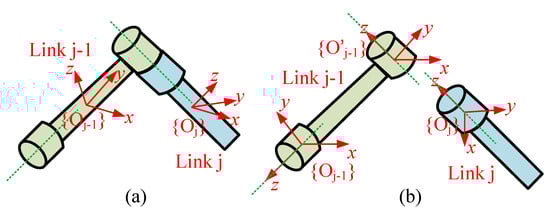 In order to reduce the number of parameters in the kinematic model, a new method of assigning the local coordinate systems is proposed, as shown in Figure 2b. In this method, the origin of the coordinate system is at the center of the joint, and the direction of the z axis is along the joint line. Furthermore, an additional local coordinate system is on the same link at the joint j. Now, (1) is written as: