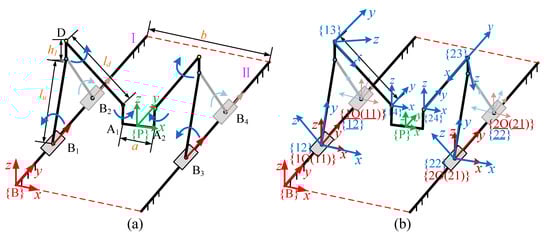 The schematic of the 3T1R parallel manipulator is shown in Figure 3a. It has a symmetrical structure, dividing it into two identical parts, I and II. This parallel manipulator contains four linear actuators , , , and . Each linear actuator to the midpoint of the end effector p is regarded as a branched chain. On side I, the branched chains formed by and to the end p point are recorded as i and , respectively, where ; on side II, the branched chains formed by and to the end p point are recorded as i and , respectively, where . Any one of the branched chains from and and any one from and are chosen to build the entire parallel manipulator kinematics, so there are four possible combinations. In this article, and are chosen for kinematic calibration and recorded as the branched chain, , which is the structure indicated by the dark solid line in Figure 1. Surely, because this parallel manipulator structure is symmetrical, the remaining two branch chains can be used to carry out the calibration as well for cross-validation. This also helps to enhance the accuracy of the kinematic model.