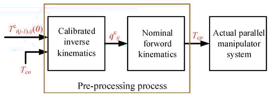 The accuracy of measurement has a great impact on the calibration. Various devices have been used to perform the calibration experiments on parallel manipulators, such as the ball and stick system [], the magnetic processing ball [], vision [], the laser tracker [], etc. Since there are multiple passive joints in the 3T1R parallel manipulator, installation of sensors on every passive joint for calibration purposes will be costly. The identification of the kinematic error model parameters is performed by minimizing the deviation between the theoretical and measured values of kinematic error, such as nonlinear least squares optimization [], but the optimization efficiency may be low due to the nonlinear nature of the model. The error pre-processing compensation will be performed after obtaining the kinematic error model. This step is to use the identified parameters to modify the active joint variables, so that the absolute positioning accuracy of the parallel manipulator is enhanced [].