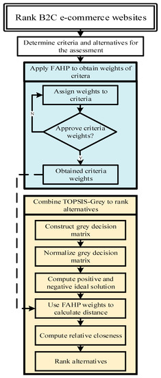It is identified in the literature that numerous studies relate to the evaluation of B2C e-commerce websites by determining the critical factors. These studies used numerous MCDM methods to assess the decision problem. This research further contributes to the state-of-the-art methods by developing an integrated decision framework comprising of Fuzzy AHP and TOPSIS-Grey methodology to assess the B2C e-commerce websites in the context of China. The Fuzzy AHP is widely recognized as one of the effective techniques for the weight allocation of criteria and sub-criteria. It has the advantage of simplicity and ease of use, but it is not sufficient to take into account the uncertainty related to the mapping of one’s perception to a number. Moreover, the qualitative assessment of respondent judgement is vague, and it is not reasonable to represent it in terms of precise numbers. As such, in order to address this apprehension, the TOPSIS-Grey concept was proposed in this study to compensate for the insufficiency of Fuzzy AHP regarding the uncertainty problem, to identify the ideal alternative solutions.