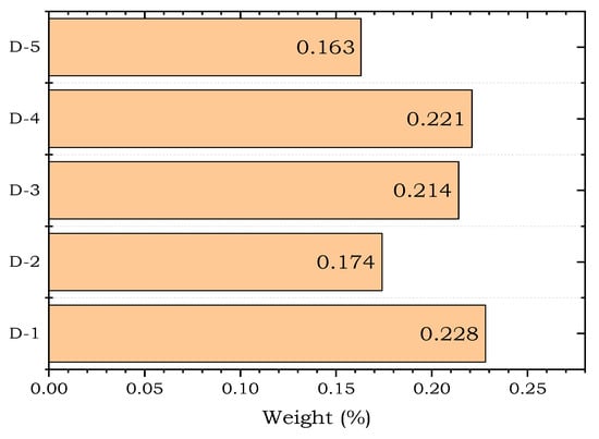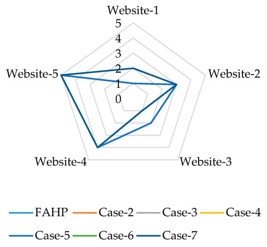 After computing the main factor’s weights, the Fuzzy AHP computed the weights of sub-factors with respect to the main factor using similar steps to those used for calculating the weights of the main factor. A total of five pairwise matrices were constructed (one for each main criteria), which are given in Appendix A (Table A2, Table A3, Table A4, Table A5 and Table A6). By solving these matrices, we get the sub-factor weights with respect to their respective main factor. Figure 4 presents the weights of sub-factors with respect to the Design criterion. Under this criterion, the sub-criterion Attractiveness (D-1) received the highest weights of 22.8%, followed respectively by Speed (D-4) 22.1%, Content (D-3) 22.4%, Easy Navigation (D-2) 17.4%, and Mobile-friendly (D-5) 16.3%.