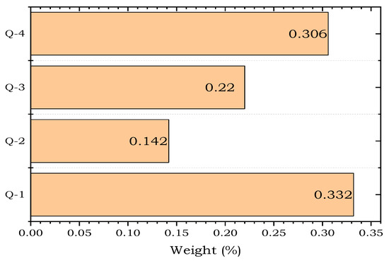 Figure 6 shows the sub-factor weights with respect to the Service Quality criterion. It can be seen that the sub-criterion Trust (Q-1) received the highest weight of 33.2%. The sub-criterion Easy Returns (Q-4) got the second-highest weight of 30.6%. The On-time delivery (Q-3) and Payment Alternatives (Q-2) sub-factors obtained the second lowest and lowest weights of 22% and 14.2%, respectively.