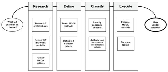 Our proposal identifies and suggests the criteria required for IIoT Platform selection for a MCDA exercise with PROMETHEE-II method, enabling organizations to compare results and make a well-founded decision. This work does not provide a universal and definitive solution, but, rather, it proposes the methodology that any organization, be it small or large, can use to decide on the IIoT platform that best suits their circumstances and needs. Following the general MCDA process depicted in Figure 3, the decision objective is the selection of an IIoT platform.