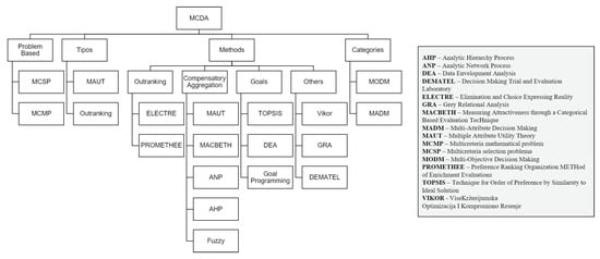 The MCDA can be classified according to the basis of the problem, by type, by category, or by the methods used to make the analysis. Figure 2 shows a taxonomy adapted from []; the methods included in this taxonomy are not exhaustive. The MCDA is a collection of systematic methodologies for comparisons, classification, and selection of multiple alternatives, each one with multiple attributes and is dependent on an evaluation matrix. Generally, it used to detect and quantify the decisions and considerations from interested parties (stakeholders) about various monetary factors and non-monetary factors to compare an alternative course of action [,]. The major division that exists in MCDA lies in the category of methodologies. First, the group considers discrete values with a limited number of known alternatives that involve some compensation or trade-off. This group is called Multiple Attributes Decision Making (MADM). The other group is the Multiple Objectives Decision Making (MODM), and its variable decision values are within a continuous domain with infinite or very numerous options that satisfy the restrictions, preferences, or priorities []. In addition, there is another classification according to the way of adding criteria, and it is divided into the American school, which aggregates into a single criterion, and into the European or French school that uses outranking methods. It can be considered a mixture of both schools and they are indirect approaches, such as the Peer Criteria Comparison methods (PCCA) [].