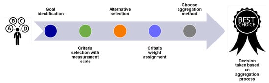 Making a decision introduces problems to individuals. One of the problems is the integration of heterogeneous data and the uncertainty factor surrounding a decision, and the criteria that usually conflict with each other [,]. To carry out a MCDA process, a series of tasks is proposed, based on the three generic steps suggested by []: (i) identify the objective or goal, (ii) select the criteria, parameters, factors, and attributes, (iii) selection of alternatives, (iv) association of attributes with the criteria, (v) selection of weight methods to represent the importance of each criterion, and (vi) the method of aggregation. Ref. [] included a step that is left out of these proposed tasks, but which should be considered in the discussion before executing the selected action. This step is to understand and compare the preferences of the person making the decision.