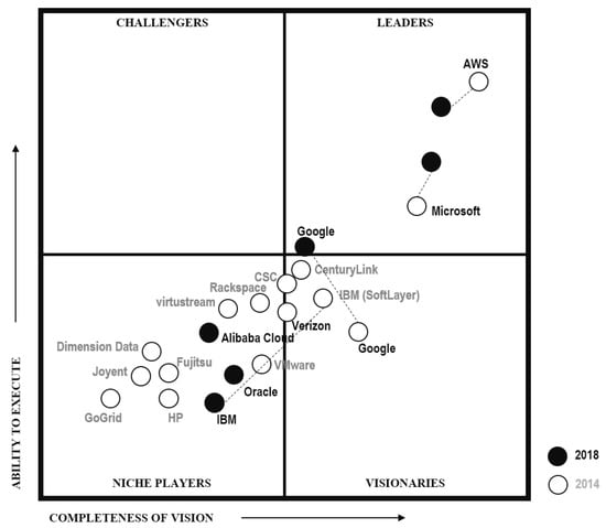 Gartner Cloud Providers Leaders Magic Quadrant 2014 vs. 2018 (adapted from [,], own creation).