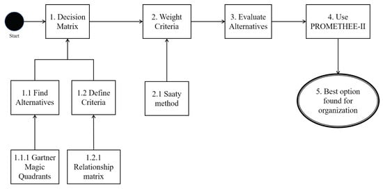 Our proposed methodology, shown in Figure 5, consists of several tasks in order to found the best alternative. The first task (Activity 1) is to define a decision matrix, taking in consideration sub tasks. It is required to find the alternatives available in the market (Activity 1.1). A good source of information is to rely in recognized entities such as Gartner Consulting (Activity 1.1.1), which has been recognized as a trusted source of information to perform studies to find who are the leaders, challengers, niche players, and visionaries; other sources may be Forrester and IDC, but, for our study, we took Gartner. In next activity, criteria is defined (Activity 1.2) supported by elaborating a relationship matrix (Activity 1.2.1) as presented in Figure 6 using the defined criteria proposed in Table 3. It consists of fourteen items available, named , where , and , arranged in the three main areas.