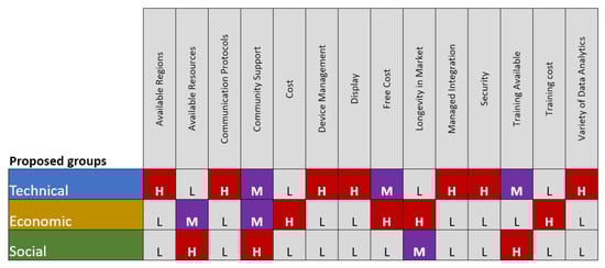 When evaluating the relationship each of the criteria proposed has with the three groups suggested, it is clear that the technical group will have {Available Regions, Communication Protocols, Device Management, Display, Managed Integration, Security, and Variety of Data Analytics}. The same treatment occurs for economic and social groups. The criterion having high and medium relationship could be argued to have a certain degree of impact in the related groups, but the highest relationship is taken to classify the criterion. It was found that there is no criterion with a high relationship in two or more groups. In addition, the relationship matrix suggests which group may have more impact during decisions, which has to be verified later. In this relationship matrix, the technical group is the one with the most elements (seven), then Economic group with four elements, and, finally, the social group got three elements.
