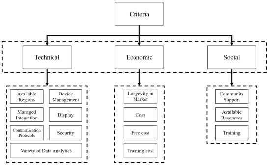 Criteria found in literature are purely technical with some hints of economy, and can be found as part of the characteristics of IIoT architecture []. However, when implementing an IIoT platform, non-technical aspects should also be considered. As the platform to be considered has its foundation in the cloud, it is valid to review the criteria included in previous MCDA exercises to select a cloud provider, looking for non-technical aspects.