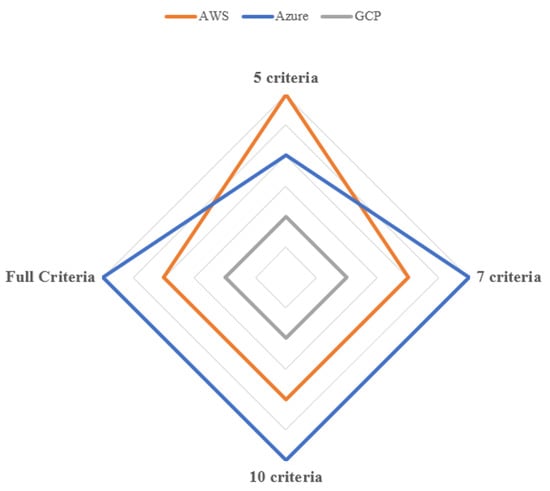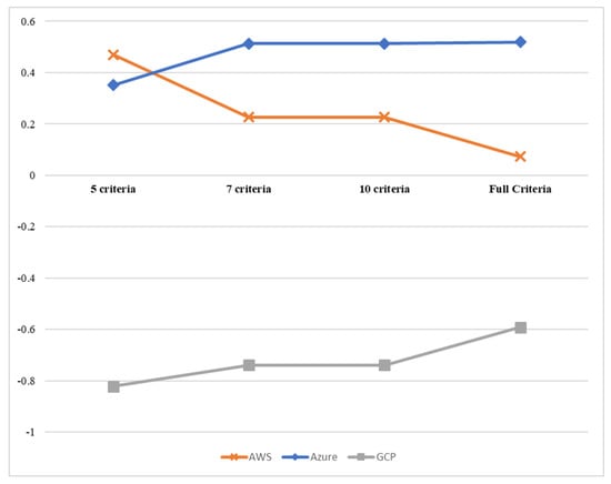 In addition, we found that there is a change of index values when adding criteria. Figure 9 depicts how alternative AWS lowers when adding criteria, and alternative GCP increases. It can be observed also how alternative Azure remains not only as the best alternative, but also consistent in the index value.