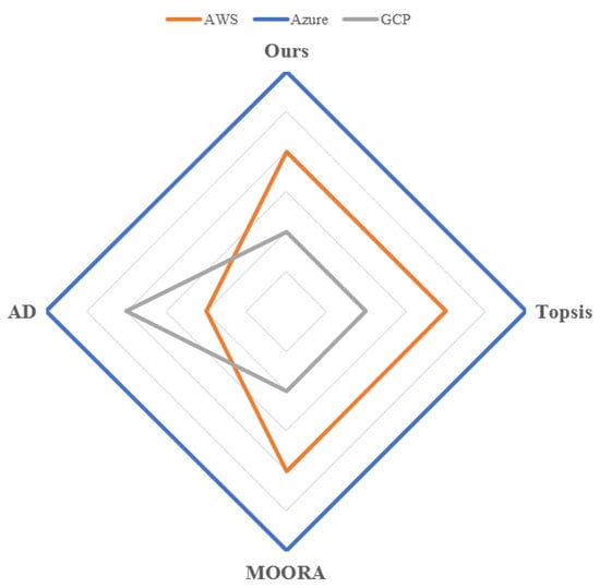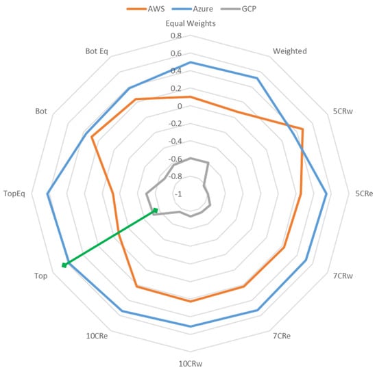To verify that this is a significant subset, this subset called “Top” is evaluated in PROMETHEE-II, and, to double check our selection, we add three more scenarios: top subset with equal weights (TopEq), bottom criteria (Bot), and bottom criteria with equal weights (BotEq). The results in Figure 12 show an extremely well performance selecting the alternative (Azure) with the largest separation from the other two alternatives, being AWS and GCP with negative numbers, in both Top and TopEq scenarios. In comparison with our full criteria set (weighted in the graph), Top and TopEq scenarios show the largest distance between alternative and (AWS). In addition, it can be observed that Bot and BotEq scenarios are very close each other, with less separation between and . Finally, the criteria subset labeled Top provides the highest rank index, suggesting that the selected subset is feasible to be the minimum set required.