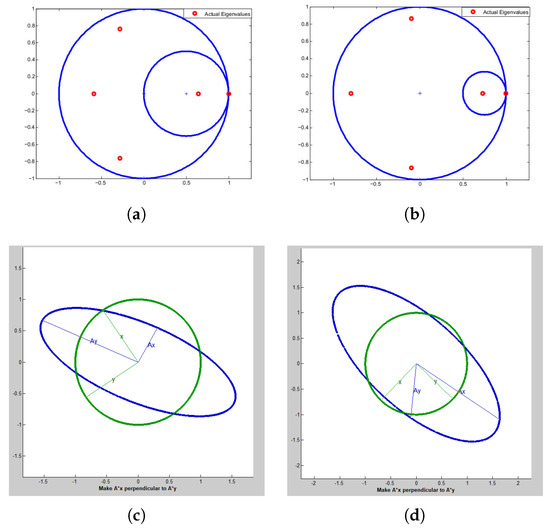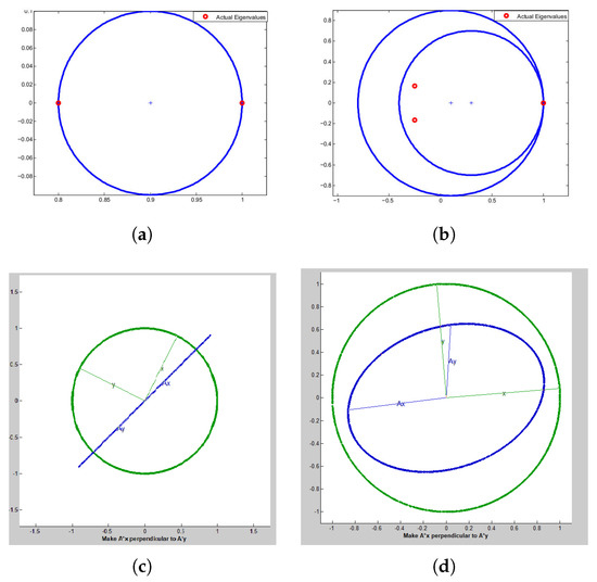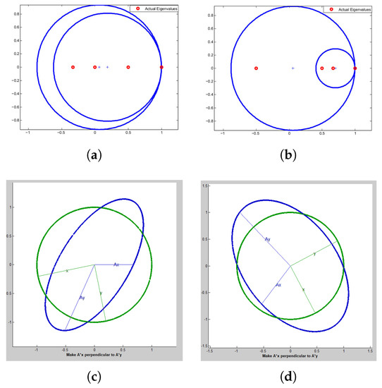 Example 3. We take eight and nine dimensional doubly stochastic matrices from [18]. The largest eigenvalue corresponding to each matrix attains the maximum value 1. The spectrum is shown in Figure 3a,b of Example 3, respectively. The Figure 3c,d show the geometrical interpretation of the singular values and singular vectors of Example 3, respectively. 5. Computing Structured Singular Values