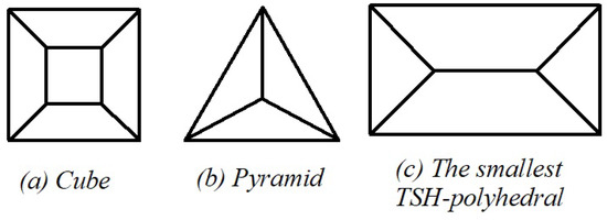 One can easily see that in a TSH-polyhedral graph with t triangles, s squares and h hexagons, we yield that , and . Consequently, we obtain either or or . If , then F is TH-fullerene. If , then and F is SH-fullerene. If , then and F is a polyhedral graph with exactly two triangles, three squares and h hexagons. The cube graph is the smallest SPH-polyhedral graph which has no hexagonal face, see Figure 1a. The symmetry group of this graph is isomorphic to , see [16]. The pyramid is the smallest TPH-polyhedral graph, see Figure 1b. The smallest TSH-polyhedral graph has no hexagon, see Figure 1c.