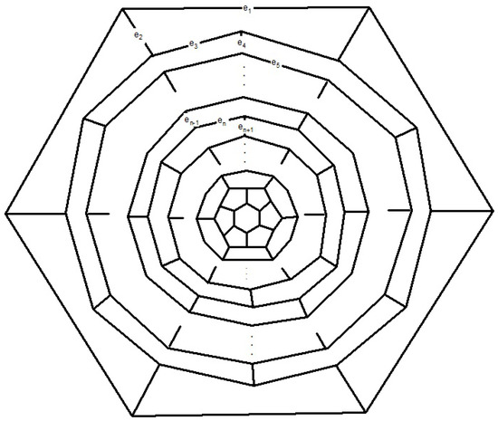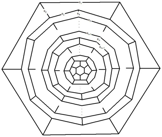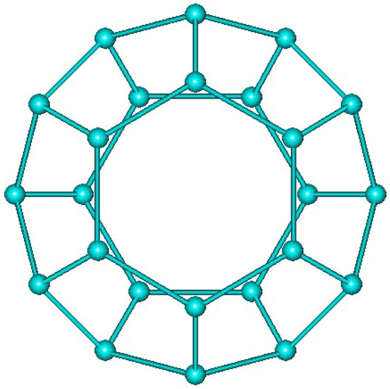 Here, we introduce an infinite class of cubic polyhedral graph composed of quadrilateral, hexagonal and octagonal faces, see Figure 25. This class of cubic polyhedral graphs has exactly vertices where . We denote this new family of cubic polyhedral graph by . Let and m be the number of squares, hexagons and octagons, carbon atoms and bonds between them, in a given cubic polyhedral graph F. Since each atom lies in exactly 3 faces and each edge lies in 2 faces, the number of atoms is , the number of edges is and the number of faces is . By Euler’s formula and then . This leads us to conclude that and , for .
