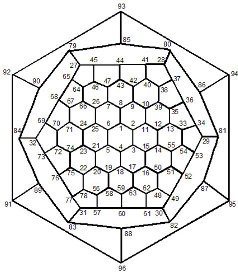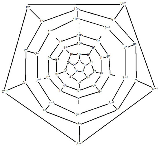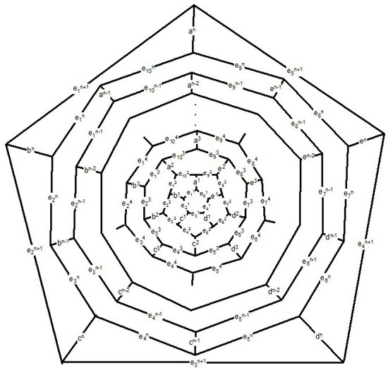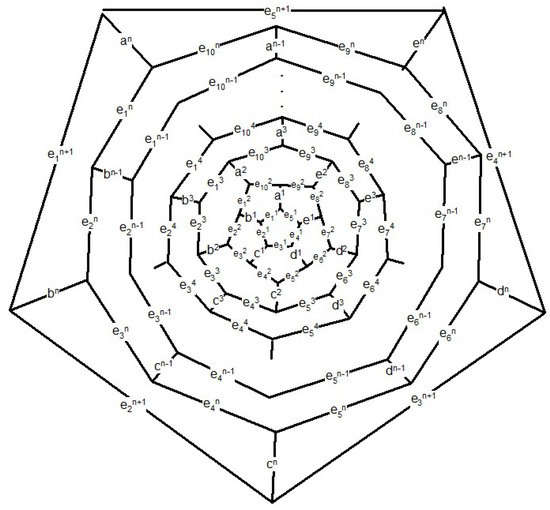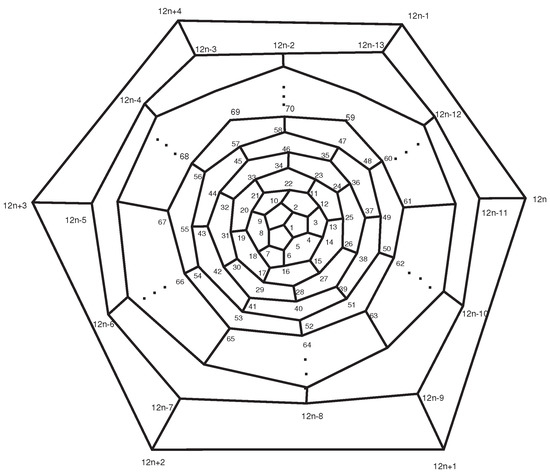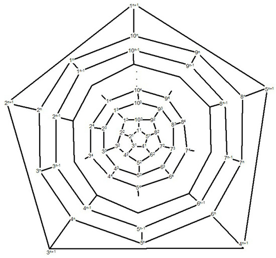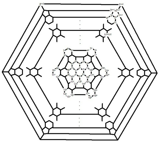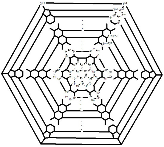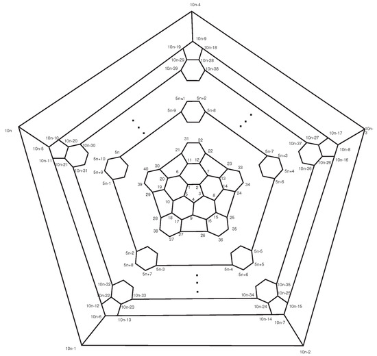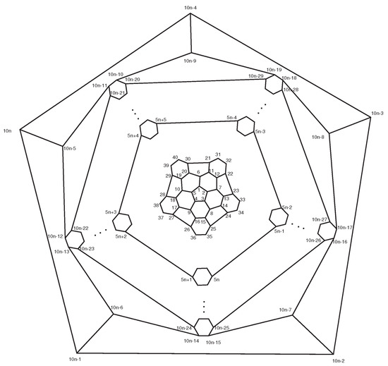 Consider the fullerene graph (n is even) as depicted in Figure 6. The vertices of central pentagon is labeled by . These vertices compose the first layer of . The vertices of the second layer are the boundary vertices of five pentagons adjacent with the central pentagon and so on. In [40], it is shown that the following elements are in the automorphism group of fullerene graph . The automorphism α is a symmetry element in which and σ It is clear that and . On the other hand, every symmetry element which fixes , must also fix . The identity element and the symmetry element α do this. Hence, the orbit-stabilizer property ensures that |A| = | |.|A| and thus which implies that The orbits of the automorphism group are given in Table 1.