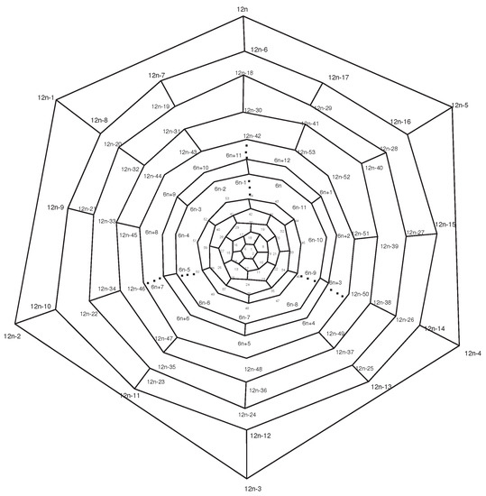 In continuing, we count all orbits of 1,…,10n} under the action of automorphism group. Again consider the fullerene graph , where n is even, as depicted in Figure 8. We find the presentation of elements . It is not difficult to see that there are five symmetry elements of order 2 in denoted by . Clearly, we have . In other words, one can easily check that This means that . Suppose is an involution that maps to , to , to , to , to , to , to , to , to , to , to , to , to , to , to , to and so on. It is clear that fix . By continuing this method, all permutation presentations of ’sare as follows: