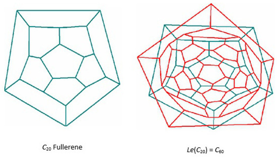 Suppose C is a fullerene on n vertices. By means an operation which is called the Leapfrog principle, we can construct bigger fullerenes with the same symmetry group. To do this, put an extra vertex into the centre of each face of C. Then connect these new vertices with all the vertices surrounding the corresponding face. Then the dual polyhedron is again a fullerene with vertices, 12 pentagonal and (3n/2)-10 hexagonal faces, see [43,44]. For example, in Figure 20 it is shown that Le(C) = C.