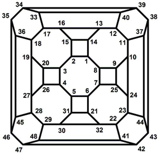 Here, we compute the order of automorphism group of polyhedral graph depicted in Figure 25. We compute the order of of symmetries of the polyhedral graph , for depicted in Figure 26. Clearly, the automorphism group of for can be computed similarly. If α denotes the rotation of the through an angle of around an axis through the midpoints of the front and back faces, then the corresponding permutation is Thus the orbit of the subgroup is . Now, consider the axis symmetry element which fixes no vertices, it is as follows: Clearly, According to the orbit-stabilizer property while no element fixes 2. This means that and so . It is clear that and thus, . On the other hand, every automorphism preserves the adjacency and thus there is no vertex u other than and a permutation with . This implies that and hence . It is not difficult to see that where and One can verify then and the proof is complete.