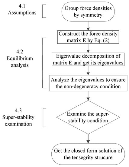 In this section, we are going to describe the form-finding method in detail and take a few examples to make it brighter. The process of the analytical form-finding method can be divided into assumptions (Section 4.1), equilibrium analysis (Section 4.2) and super-stability examination (Section 4.3) in terms of force densities. It should be noticed that the method is only suitable for regular and symmetric tensegrity structures. A brief flowchart of this method is presented in Figure 1. Assume that the topology and the type of each member are given.