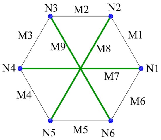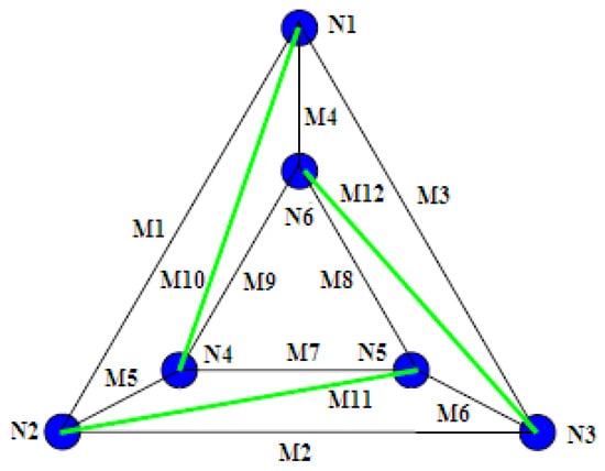 Suppose that the triangular prism tensegrity structure, shown in Figure 3, has four kinds of force densities: q1, q2, qb, and qs. q1 represents the force density of cable element M1, M2, M3; qb denotes the force density of M4, M5, M6; q2 denotes the force density of M7, M8, M9, and qs denotes the force density of struts. Then the force density matrix E can be given as