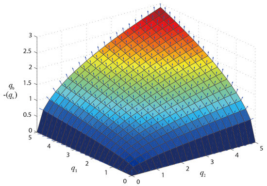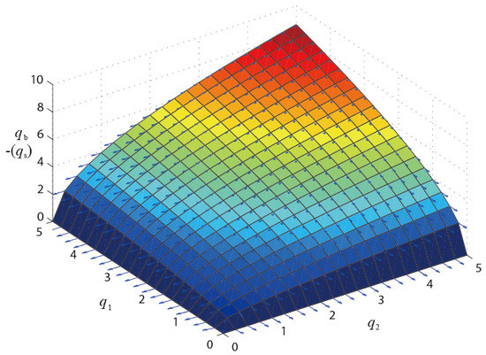 From Equation (12), it should be noticed that qs is a negative value. Assume that λ2 is greater than zero. Therefore, λ3 and λ5 are always greater than zero. Then assume λ4 and λ6 equal to zero, so relationship among q1, q2, and qs is obtained as