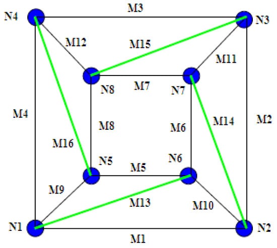 Suppose that the quadrangular prism tensegrity structure, which is shown in Figure 5, has four kinds of force densities: q1, q2, qb, and qs. q1 represents the force density of elements M1, M2, M3, M4; q2 represents the force density of M5, M6, M7, M8; qb represents the force density of M9, M10, M11, M12; and qs represents that of struts. Then the force density matrix E can be given as