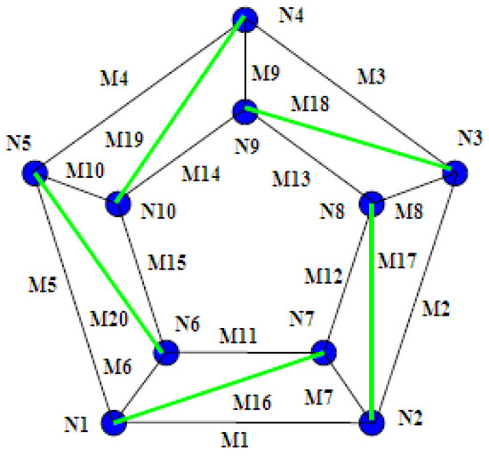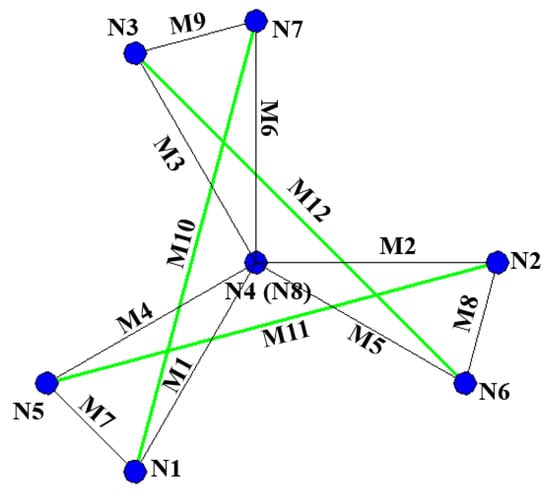 Suppose that the star-shaped tensegrity structure, as shown in Figure 9, has four kinds of force densities: q1, q2, qb, and qs. q1 represents the force density of elements M1, M2, M3; q2 represents the force density of elements M4, M5, M6; qb represents the force density of elements M7, M8, M9, M10; and qs represents that of struts. Then the force density matrix E can be given as