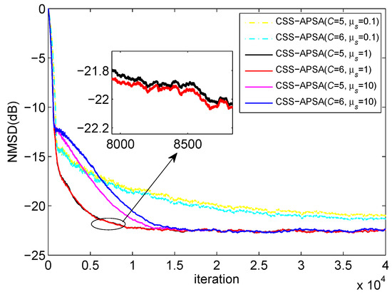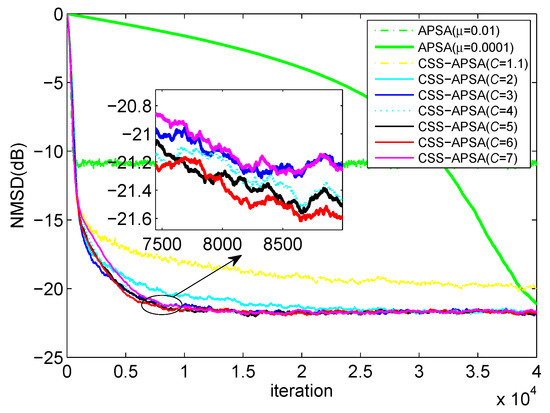 First of all, we investigated the influence of the parameter C on the performance of CSS-APSA. We chose , . Figure 2 shows the corresponding NMSD curves. From this figure, we know that CSS-APSA with and can realize better filtering performance than that of other C values. In other words, proper C values can enhance the filtering performance of CSS-APSA. This result demonstrates the effectiveness of constraint on .
