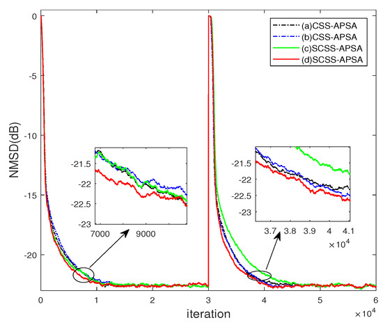 Thirdly, we investigate the effect of parameter on the performance of MCSS-APSA. We set and . The NMSD curves are plotted in Figure 5, which shows that: