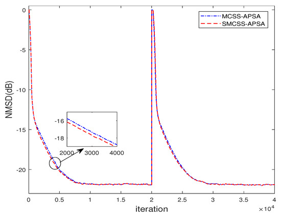 The NMSD curves of MCSS-APSA and SMCSS-APSA with , .