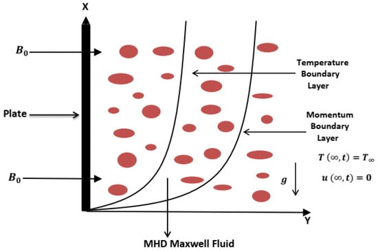 Non-Newtonian fluids such as paints, toothpastes, plastics, and foodstuffs are attractive to researchers because of their significant practical utility in modern and emerging technologies. In recent years, forced and free convection flows of such fluids influenced by magnetohydrodynamic (MHD) force have been in high demand in MHD generators, energy generators, polymer fabrication, accelerators, power elevators, aerodynamic heating, and the purification of mineral oil [,]. Engineers and hydrologists have examined the fluid flows in porous materials ranging from sand packs to fused Pyrex glass in order to forecast their reactions in several types of reservoir []. The goal of anticipating the behaviors of all non-Newtonian fluids cannot be served by considering a single model. The nonlinear relation between shear rate and shear stress makes the flow equations more complex than the Navier–Stokes equation can explain, and enhances their order [,]. The handling of such flow equations is not trivial, because of nonlinear supplementary relations in the momentum equation. However, a number of models exist to predict the features of such fluids. Three main categories of such models involve integral, differential, and rate type models. From a research perspective, rate type models are more practical as they anticipate both memory and elastic effects. Therefore, in the current work, a sub-category of rate type model known as the Maxwell model is considered. This model was first initiated by Maxwell to forecast the visco-elastic features of air []. The Maxwell model is an elementary rate model utilized for predicting fluids’ rheological behavior and has the properties of both viscosity and elasticity.